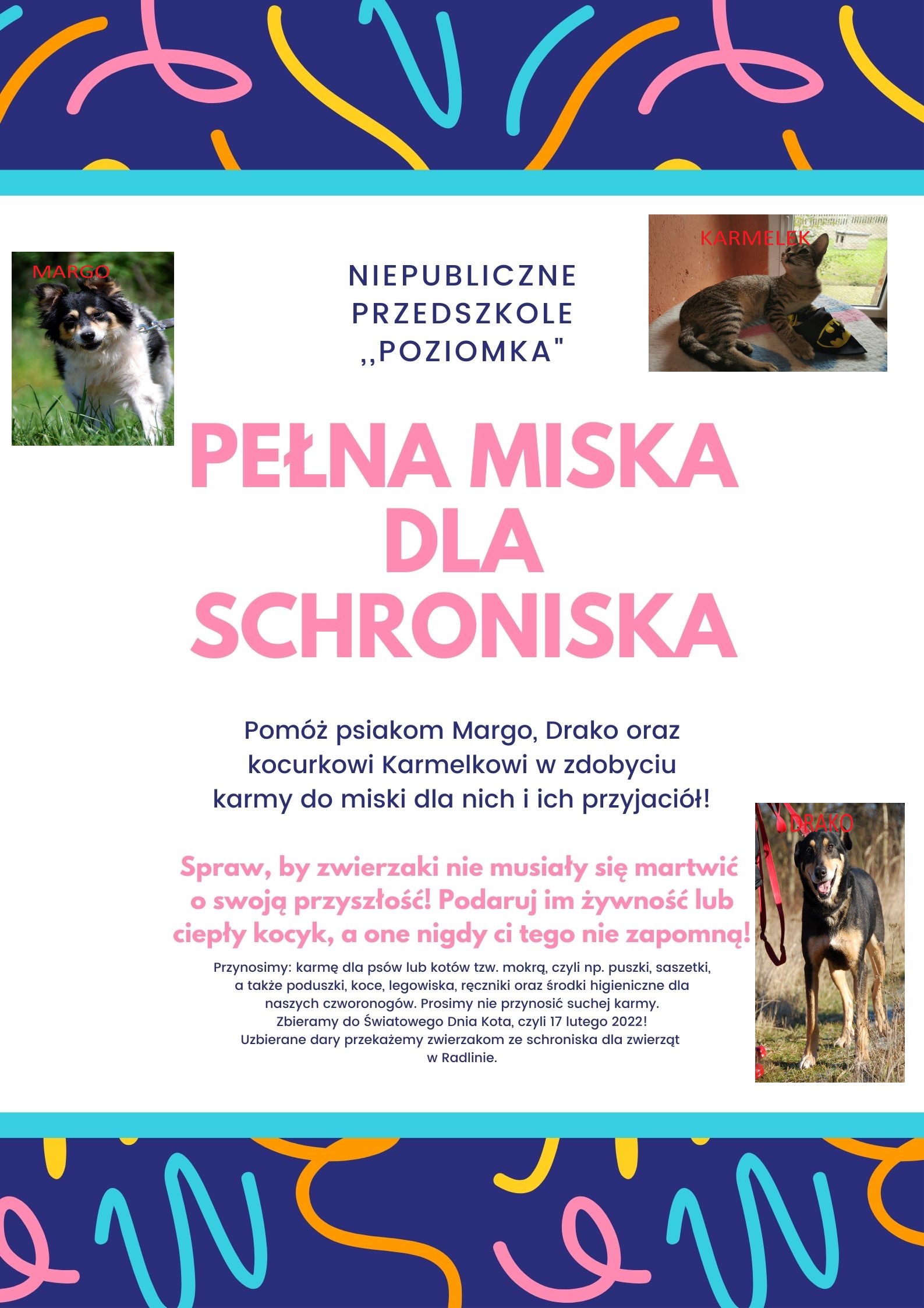 Nasze przedszkole rusza z akcją ,,Pełna miska dla schroniska". Co można zrobić, by pomóc❓ Wystarczy, że przyniosą Państwo mokrą karmę tj. puszki, saszetki, artykuły higieniczne dla zwierząt lub tekstylia np. koc, ręcznik i zostawią na półpiętrze w specjalnie oznakowanym pudle zdjęciami podopiecznych schroniska. Podarujmy bezdomnym zwierzakom pełne miski i brzuszki🐕❤🐈