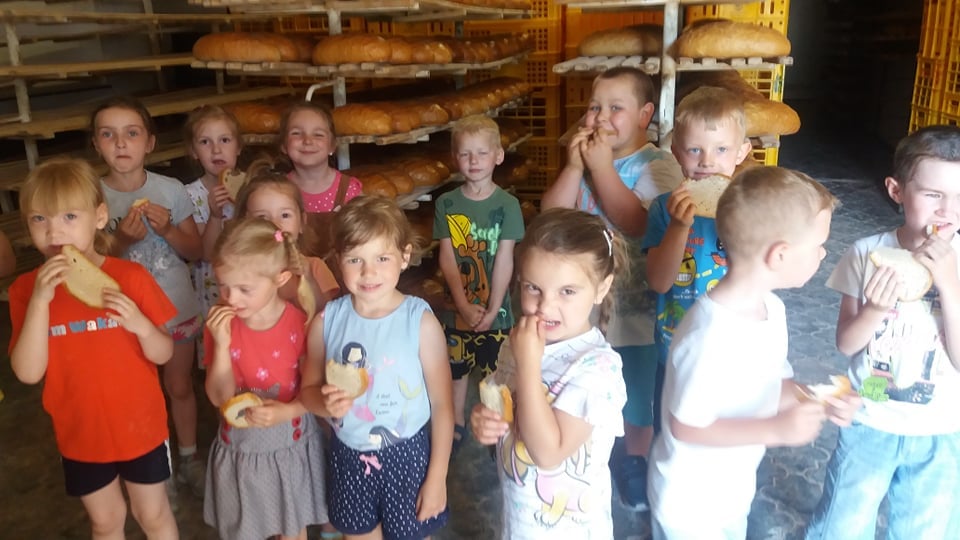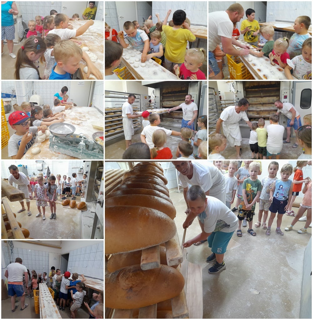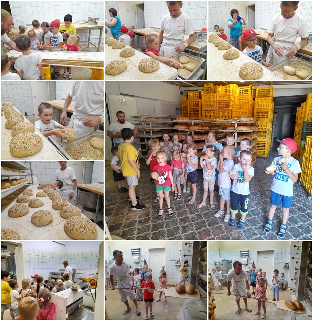 Dzieci z grupy Motyle 17 czerwca zapoznały się z różnymi urządzeniami wykorzystywanymi w piekarni do przygotowania ciasta na różne rodzaje pieczywa, dowiedziały jakie urządzenia przydatne są do produkcji bułek, pakowania chleba oraz poznały przeznaczenie wielkiego pieca. Każdy przedszkolak pamiętał o zasadach bezpiecznego zachowania się w tym miejscu. Dzieci wcieliły się również w role małych piekarzy i same wyrabiały ciasto na chleb i bułki, które pan piekarz umieścił w piecu do wypieku. Była także najprzyjemniejsza chwila, czyli degustacja pysznego chleba. Dzieci wróciły z tej wycieczki pełne wrażeń i wzbogaconej wiedzy na temat etapów powstawania chleba.Wielu z nich zapragnęło w przyszłości wykonywać zawód piekarza.